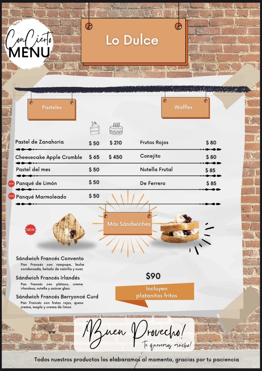 Welcome to ConCierto Cafe, a cozy haven nestled in Playa Miramar 563, Iztacalco, where flavors meet ambiance. This charming cafe boasts a delightful menu, perfect for food lovers and coffee enthusiasts alike. Customers rave about their delectable sandwiches and molletes, paired beautifully with rich coffees, craft beers, and fine wines. Also not to be missed is the indulgent Apple Crumble cake, which has garnered mixed feelings but stands out for its flavor.
